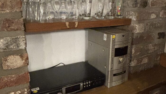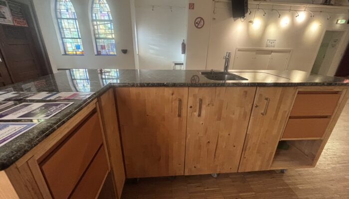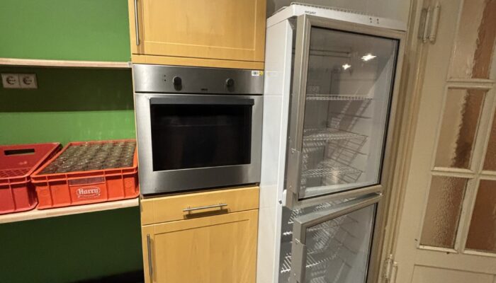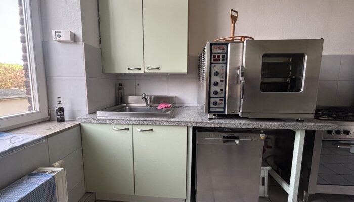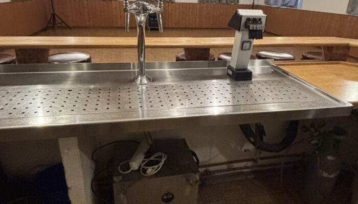 Zur Ausstattung gehören eine große Theke mit Zapfanlage sowie eine voll eingerichtete Küche mit Herd, Spülmaschine, großem Kühlschrank und Büffettisch.