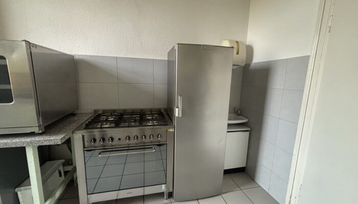 Küche mit Kühlschränken, Spüle, Backofen und Kochfeld (Gas)
